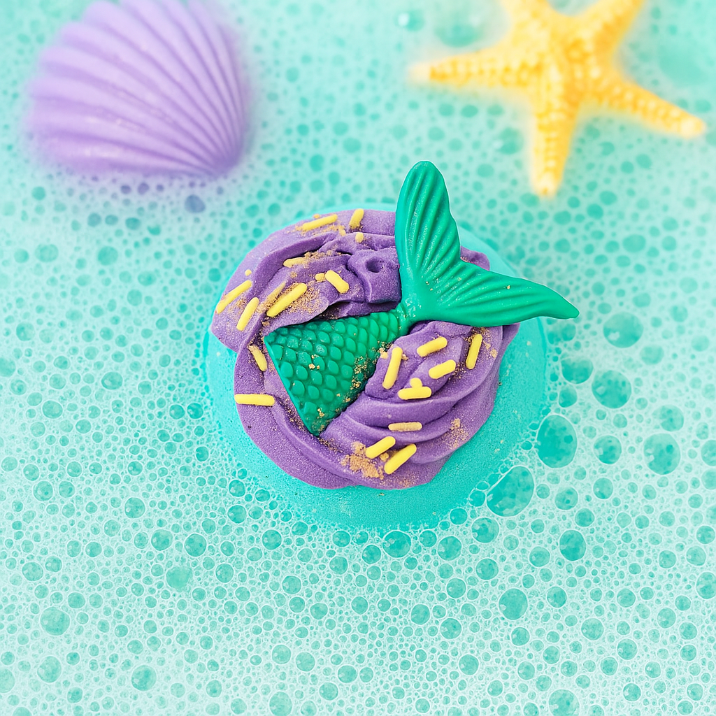 The kiddos and adults love this fun Mermaid Bath Bomb. Its A fresh ocean scent with notes of daylily, sea spray, watery florals and musk. With a mermaid tail soap giving your bath water some bubbles.