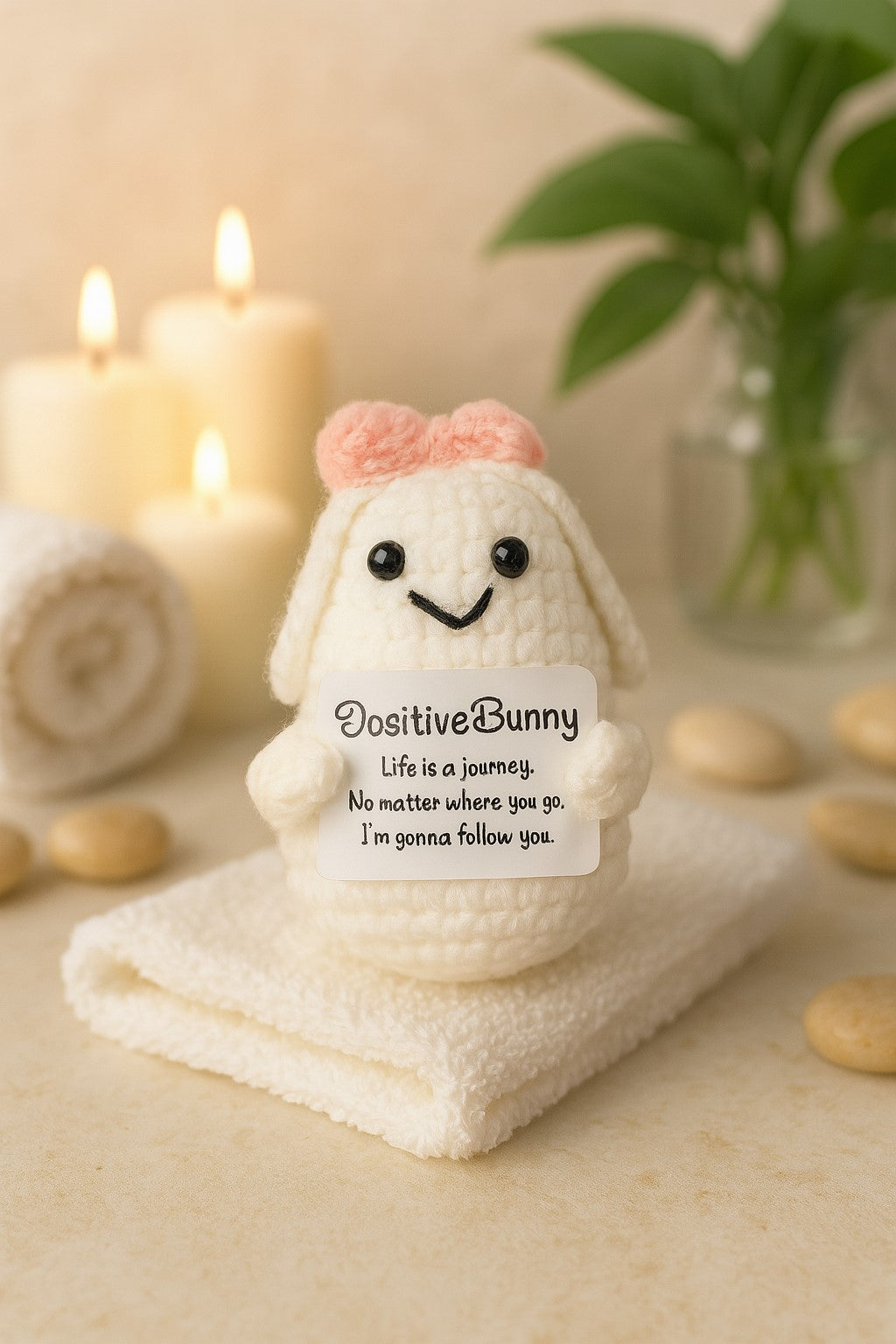 Meet the Positive Bunny, your soft and loyal reminder that you’re never alone. With her cozy ears, sweet pink bow, and loving message, she’s here to bring calm and comfort wherever your journey takes you.